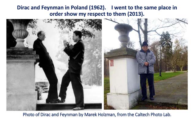 Yet, the names of Feynman and Dirac are prominently displayed in the history table given in Figure 5. They have been and still are my great inspirational figures, and I have been eager to place them into one box according to the Hegelian process of synthesis. In order to show my gratitude toward them, I visited in 2013 the Jabllona Palace north of Warsaw where they met in 1962, as shown in Figure 9. In had the pleasure of my photo taken at the spot where they spoke to each other. Their photo shows a lack of communication between them. It has been a great challenge for me to fix the gap between them. Finally, I am indebted to John S. Toll who provided my meeting with Dirac in 1962. He was always helpful to me whenever I whenever needed help throughout my academic career.