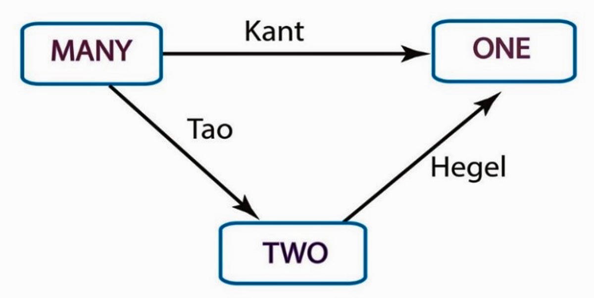 Kant was born in East Prussia (now Kaliningrad, Russia), and spent 80 years of his entire life there. Thus, his way of thinking was framed by what he saw every day. His area was a maritime commercial hub of the Baltic Sea, just like Venice in the Mediterranean world. Many people came to Kant’s place with many different points of view for the same thing. Thus, Kantianism and Taoism were developed in the same way, as illustrated in Figure 4. Kant wanted one, but Chinese had to settle with two. Thus, Taoism can stand between Kant and Hegel. We can thus integrate Kant and Hegel by placing Taoism between them. We can illustrate this integrated Kant-Hegel system in terms of the history of the United States. Europeans with different backgrounds came to the new land and settled down in many different areas. They then set up their own government. In order to develop their laws and national policies, they developed two different political parties. These two parties produce the laws and policies applicable to all citizens. This American system is admired by many people of the world. This is an integrated Kant-Hegel system, as is illustrated in Figure 4.