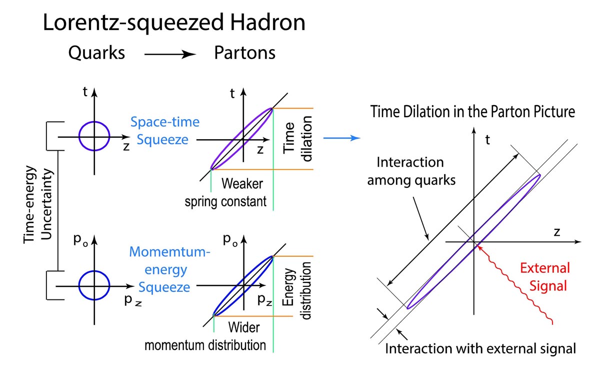 Indeed, according to this figure, the quarks become light-like particles with a wide-spread momentum distribution, interacting with an external like free particles. Furthermore, since they are like light-like, the particle number is not constant as in the case of black-body radiation. Thus, this figure provides the answers to all of the puzzles raised on the parton picture listed earlier in this section. As was stated before, the proton wave function is a product of two oscillator wave functions. Using this wave function, Paul Hussar computed the parton distribution function for the proton, and it is in reasonable agreement with the observed parton distribution [25]. Let us go to Table 2. The Lorentz-covariant oscillator, which can be viewed as an integration of Dirac’s papers, provides a one formula for the proton at rest (quark model) and the ultra-fast proton (parton picture). The second row of this table is about the role of Wigner’s little group for internal space-time symmetries [26]. This row tells that Wigner’s little groups explain why the internal space-time symmetries appear differently to moving observers. Again, this is a Kantian problem and was discussed detail in the literature [13,14,16,17,18].