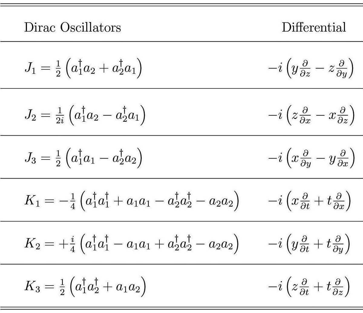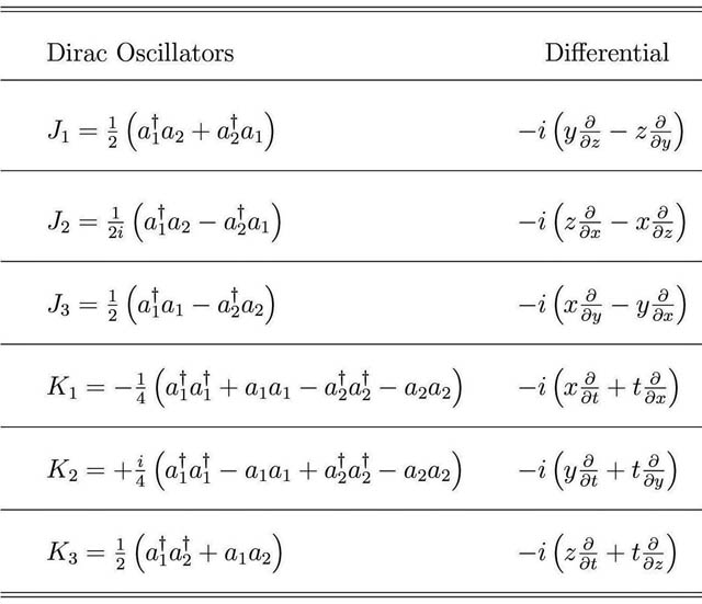 Table 3 gives three rotation generators and three boost generators with respect to the time variable t, along with corresponding Dirac’s two-oscillator forms. The operators of this table do not depend on the second time variable s. The J operators there generate rotations in the three-dimensional space (x, y, z), and the K operators generate Lorentz boosts along those three different directions. Thus, the six operators given in Table generate the Lorentz group familiar to us.