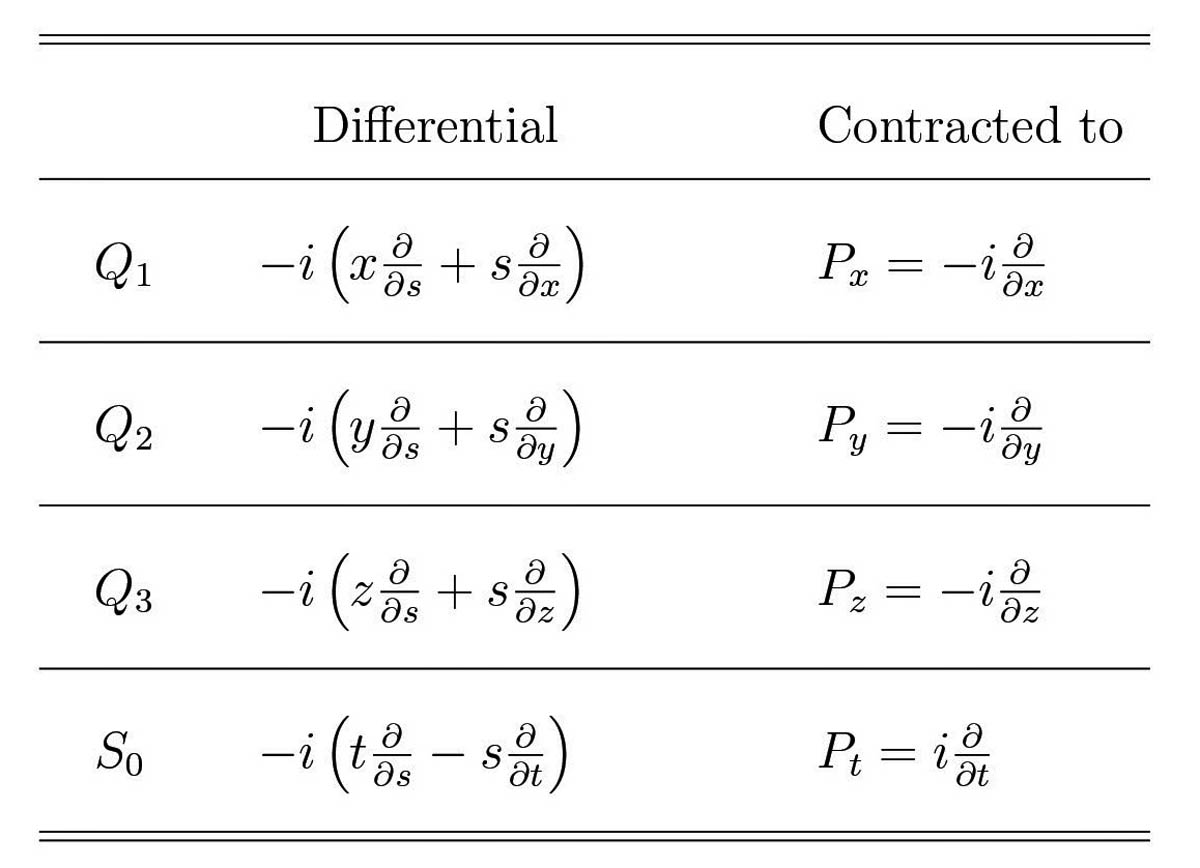 In addition to the six quadratic forms given in Table 4, Dirac constructed four additional quadratic forms. They correspond to the differential operators given in Table 4. The differential operators in Table 4 do not depend on the time variable t, but depend only on the second time variable s. We are now interested in converting the differential forms in this table into four translation generators, using the group contraction procedure introduced first by Inonu and Wigner [22]. In their original paper, Inonu and Wigner obtained the Galilean system from the Lorentzian system. Since then, this contraction procedure was used for the unification of Wigner’s little groups for massive and massless particles [14,16,17].