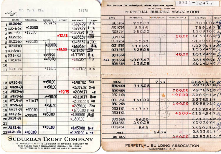 According to these bank statements, I came to Maryland from Princeton in 1962 with $2,094. I got married in 1963, and we started saving money in 1964 for our house down-payment with $700. We bought the house in 1969. We sent our son to Princeton (money money) in 1983. - This is our family photo of 1966.