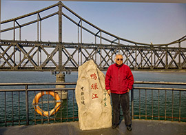 Many people go to the end of this broken bridge and take photos. I was there in April of 2014. This is a photo of myself standing there. In the background is the reconstructed span which Chinese and N. Koreans use for their trade purposes.