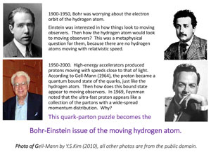 Yet, the proton is not a hydrogen atom. What does the proton with ulta-fast speed have to do with the fast-moving hydrogen atom? In 1964, Murray Gell-Mann showed that the proton is a quantum bound state of more fundamental particles called the "quarks." Thus, we can study the quantum mechanics of the hydrogen atom by looking at the proton.
