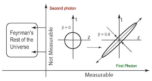 The space-time portion of this paper is from the paper I published with Wigner in 1990. The title of the paper is Entropy and Lorentz Transformations. If we do not measure the time-separation variable assuming it is hidden in Feynman's rest of the Universe, the net result is an increase in entropy and an expansion of the uncertainty region in the Wigner phase space. Click here for the phase space expansion.