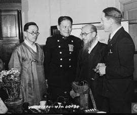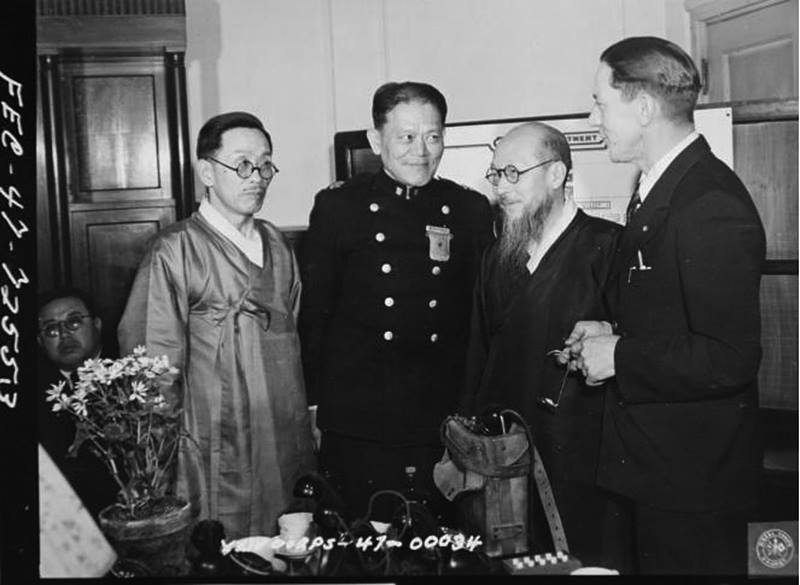 Because of his strong American background, Cho had been harshly treated by Japanese authorities, and he was thoroughly bankrupt by 1945. He had to wear a Sebiro to meet Americans, but did not have it. Thus, those well-to-do Hanmin-Dang people collected money among themselves to arrange a Sebiro for him. Cho then met Americans and got the job of organizing Korean police. Here is Cho's photo in his police uniform: