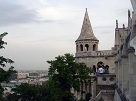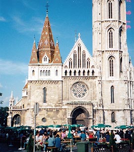 - The Mathias Church or the Buda Cathedral is also on the high ground of the west bank. This photo was taken from a fifth floor hotel room at the Hotel Sofitel Chain Bridge. The hotel window was somewhat dusty. Click here for the history and more photos.